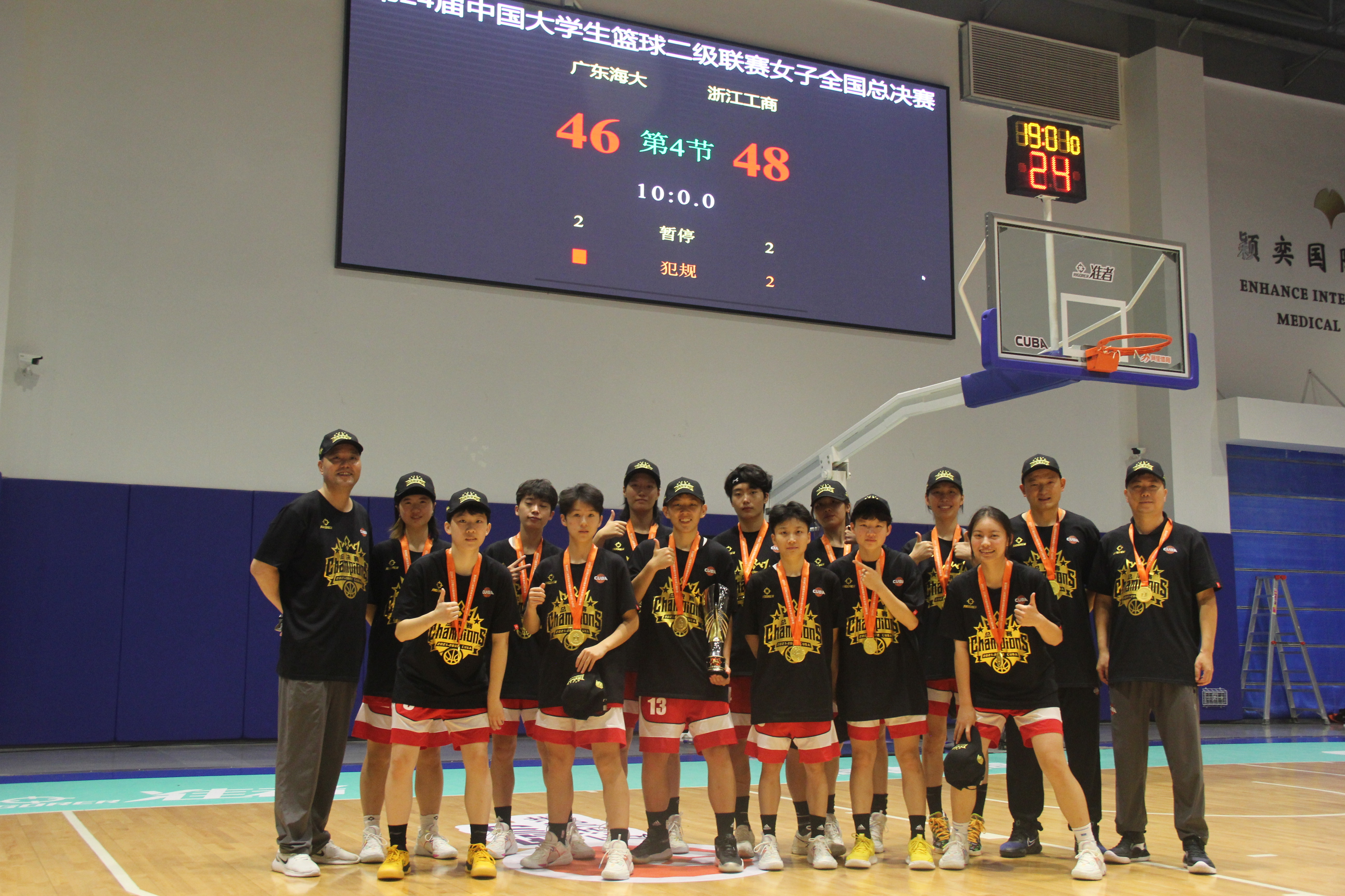 下半场回来两队展开对攻,叶雨梦单节10分,带领足交 稳固着两位数的领先优势。第三节双方战成15平,足交 以41-29继续领先广东海洋大学。末节足交 突然陷入得分荒,广东海洋大学全力反扑,打出一波10-0缩小分差,随着对方球员三分球打板命中,广东海洋大学将比分追为39-41。关键时刻马佳琪三分命中,帮助足交 及时止血。最终足交 以48-46战胜广东海洋大学,夺得第24届CUBA二级联赛女子总冠军。
